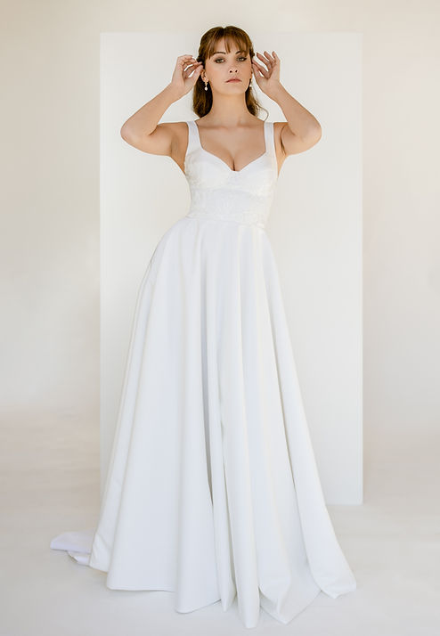 Charlotte est une robe de mariée pensée pour celles qui aiment la pureté des lignes et la force des détails. Son corset lingerie, délicatement rehaussé d’applications de dentelle, met en valeur le buste avec justesse et raffinement. La jupe, réalisée dans un satin mat, offre ampleur et structure, créant un mouvement sculptural à chaque pas. L’ensemble allie sobriété et éclat, modernité et intemporalité.