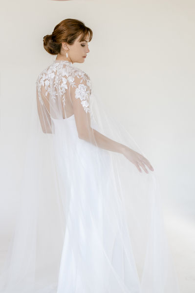 Saul est une cape de mariée qui sublime chaque mouvement avec légèreté. Confectionnée dans un tulle fin, elle se pare d’une dentelle minutieusement placée à la main. Depuis l’encolure, les motifs délicats descendent en dégradé, créant une impression de poésie en mouvement. Cette pièce d’exception offre une présence théâtrale tout en conservant une finesse aérienne.